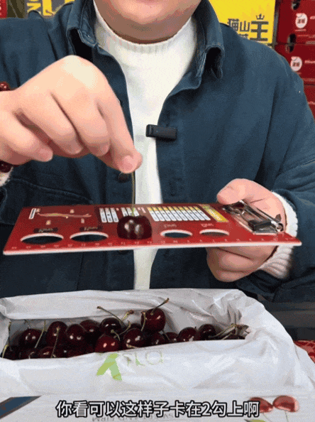 最简单就是在标准上做文章。比如有水果博主就揭秘,测试车厘子大小的卡纸上,2J的车厘子是达到不了3J标准的,但稍微换个角度就可以卡住。有一些直播间就会用这种方式偷梁换柱,抬高价格。