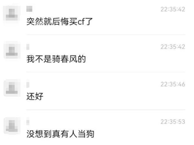 群友们纷纷直言:“骑某风的天塌了”“后悔买某风了”“这辈子都不会骑某风了”“没想到真的有人当狗”。